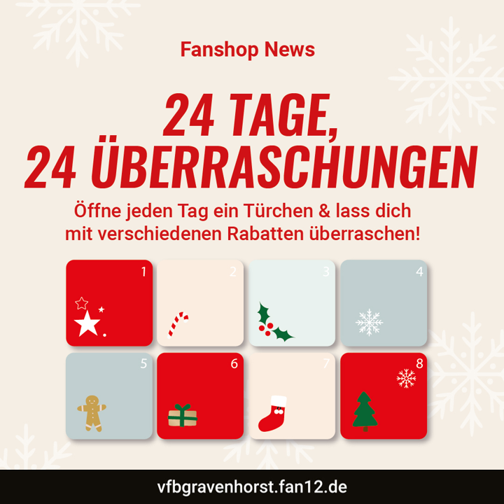 Weiterlesen ➜: NEU: Adventskalender im ShopDer Countdown bis Weihnachten startet! 🎄 Neben deinem Schoki-Kalender zuhause kannst du ab 01.12. jeden Tag ein Türchen in unserem Fanshop öffnen und dich über tolle Überraschungen freuen! Jetzt reinschauen & stöbern: vfbgravenhorst.fan12.de